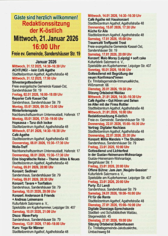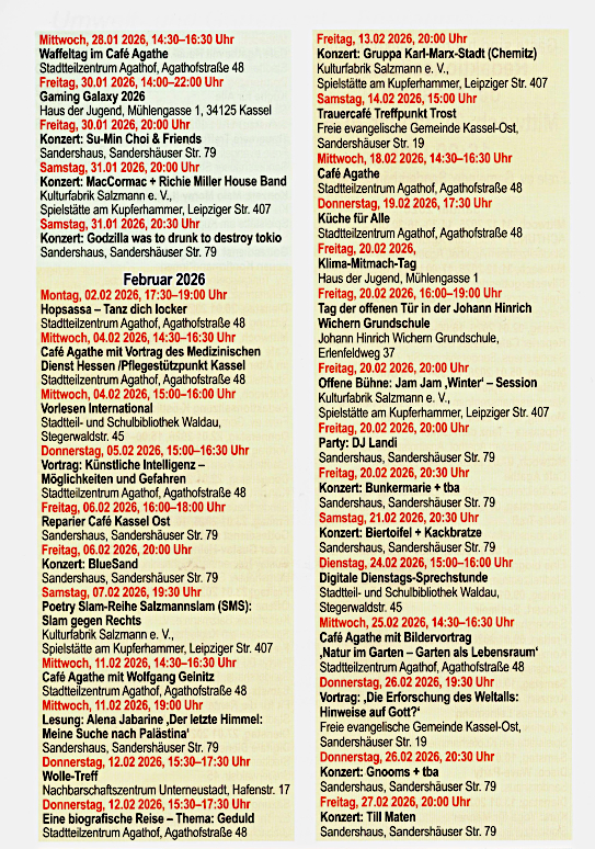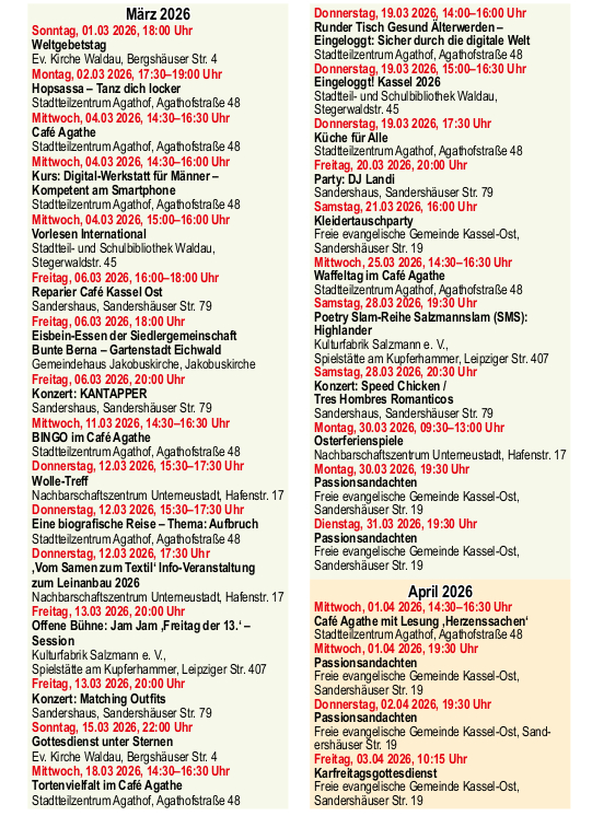 Die Veranstaltungen erheben nicht den Anspruch auf Vollständigkeit, weitere Termine auch unter Stadtteilzentrum Agathof e. V.