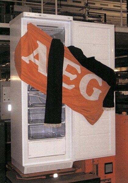 Durch die deutsche Wiedervereinigung erlebte das Werk noch einmal einen Auftragsboom, es wurden 600000 Geräte produziert, das Fließband wird durch ein fahrerloses Transportsystem ersetzt. 1994 wird die AEG-Hausgeräte-AG verkauft, Elektrolux übernimmt 1995 die Fertigungsstätte für Kühl– und Gefriergeräte in Kassel, es werden 800 Arbeitnehmer entlassen, die Produktion wird in ein Land mit niedrigerem Lohnniveau verlagert. Am 13. Dezember 2002 wird das Werk endgültig geschlossen und weitere 400 Mitarbeiter verlieren ihre Arbeit. Volkswagen mietet des Gelände der AEG Hausgeräte und verlagert bis 2004 die Aggregateaufbereitung von Baunatal auf dieses Gelände. Foto: Das letzte Gerät aus Kassel am 13. Dezember 2001