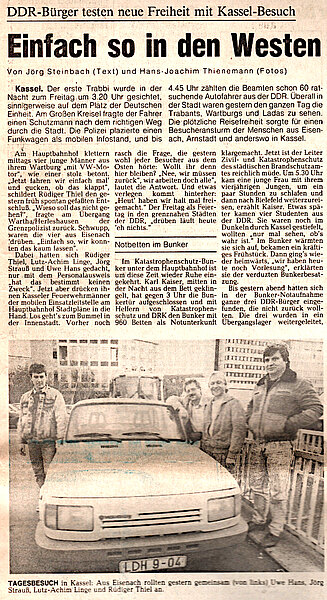 Die meisten saßen vor ihrem Fernseher und verfolgten die Nachrichten der Tagesschau oder der Aktuellen Kamera als Günter Schabowski die Reisefreiheit für die DDR Bürger verkündete. Ich bereitete in dieser Nacht mit Helfern der Feuerwehr und des Deutschen Roten Kreuzes in einem Bunker in Kassel Quartiere für die zu erwartenden DDR Bürger vor.