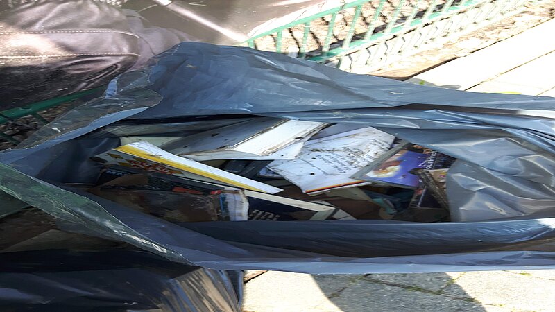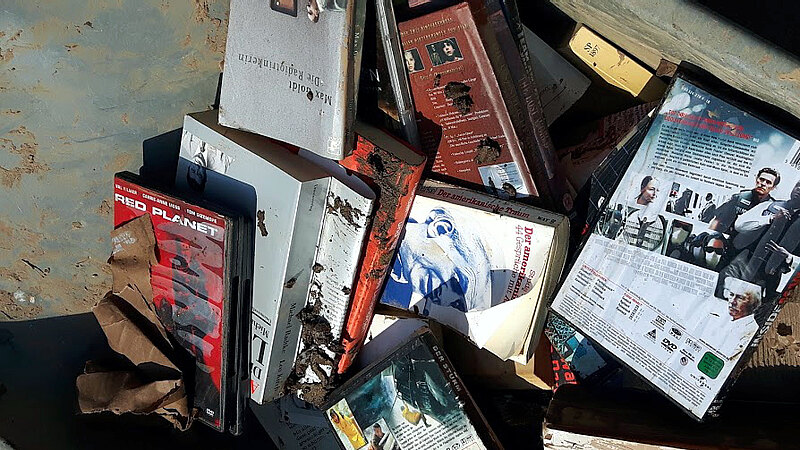 Den ganzen nassen und verschmutzten Unrat lagerten wir dann auf einem feuchten Schuttberg, hunderte Bücher, DVDs, CDs, Spiele, Spielzeug, Fotoalben und Kleidungsstücke. Die Stadtreiniger nahmen unbürokratisch alles mit, was in Säcken vor die Tür gestellt wurde. Nachts schütteten dann Sammler die am Abend hingestellten Säcke wieder aus und durchwühlten den Inhalt, ließen dann aber alles liegen. Also musste noch einmal gepackt werden.