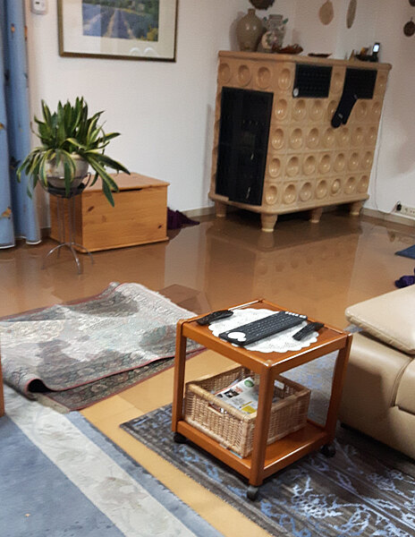Noch waren wir ganz ruhig, denn wir glaubten nicht, dass das Wasser sich den Weg in unser Wohnzimmer suchte und einen Keller hatten wir nicht - also kein Grund zur Aufregung. Doch das Wasser kam unaufhörlich näher, Zentimeter um Zentimeter stieg es an. Ein Anruf bei der Feuerwehr war zwecklos, hier wurde er erst gar nicht abgenommen. Als es dann doch geschah hieß es nur, dass sie an anderer Stelle bereits voll ausgelastet seien.