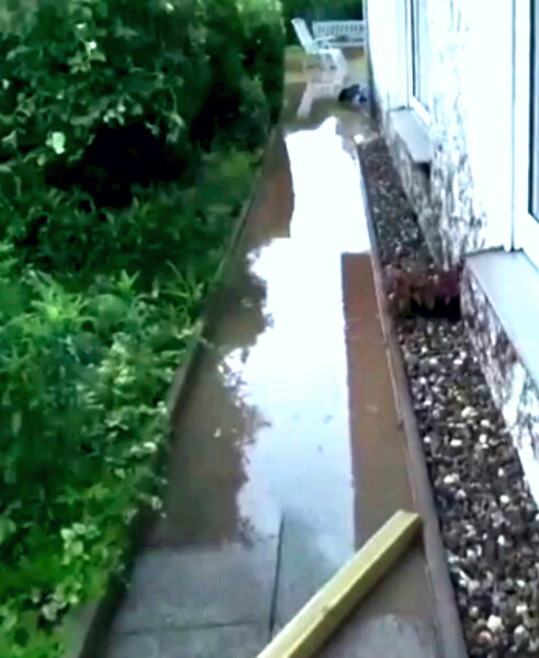 Neben dem Haus schlich sich das Wasser langsam aber sicher den etwas schrägen Weg in Richtung Eingangstür voran. Wenn es diese erreichte, dann wäre das Haus auch von vorne den Fluten ausgesetzt. Zentimeter um Zentimeter stieg es an, ein quer gelegter Balken konnte es nicht hindern.