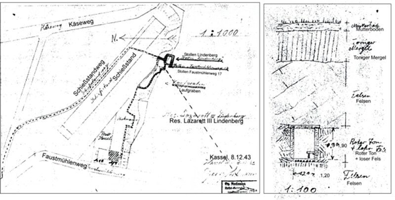 Frau Reckmann aus dem Faustmühlenweg 17 meldete sich im Jahr 2001 bei mir als Zeitzeugin. Sie ist genau so alt wie das Haus in dem sie wohnt (Faustmühlenweg 17) und in dem sie auch geboren wurde. Es war eines der ersten Häuser an dieser Stelle und es musste 1927 so groß gebaut werden, damit man es auch von Wilhelmshöhe aus sah. Ihr Vater, ein Kriegsinvalide des ersten Weltkriegs, durfte hier bauen und machte vieles selbst, so auch die Ausschachtarbeiten. Dabei fand er ein Flöz mit rotem Ton. Als dann die Fliegerangriffe einsetzten, erinnerte er sich wieder daran; daraufhin wurde der Ton entfernt, darüber befanden sich einige Meter gewachsener Fels. Innen wurde alles bergmännisch abgestützt und bei Luftwarnung suchte die Bevölkerung des Lindenbergs hier Schutz. Bis zu 1000 Menschen sollen sich hier aufgehalten haben. Da aber keine Bewetterung vorgesehen war, konnte die Luft sehr dünn werden, einmal erstickte sogar ein Kind. Es gab genehmigte Pläne für einen großen Zugang vom alten Schießstand aus, die aber wurden nicht mehr verwirklicht. So betraten die meisten Menschen den Bunker über das Reckmannsche Grundstück. Die Bunker wurden 1945 von den Amerikanern in mühevoller Arbeit 6 Wochen lang gesprengt, worunter das Haus erheblich litt.