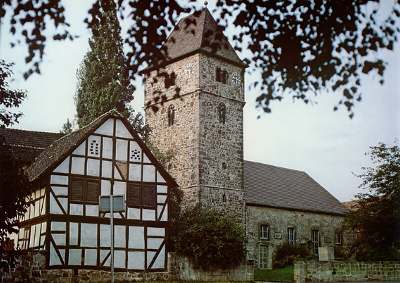 Hoch ragt der Turm der Waldauer Kirche über die Fachwerkhäuser empor. Nach dem Einmarsch der Amerikaner wurde die schlanke Turmspitze am 10. April 1945 in Brand gesteckt, weil sie den Luftverkehr des nahen Flugplatzes nicht behindern sollte. Im Jahre 1951 erhielt der Turm sein heutiges Aussehen.