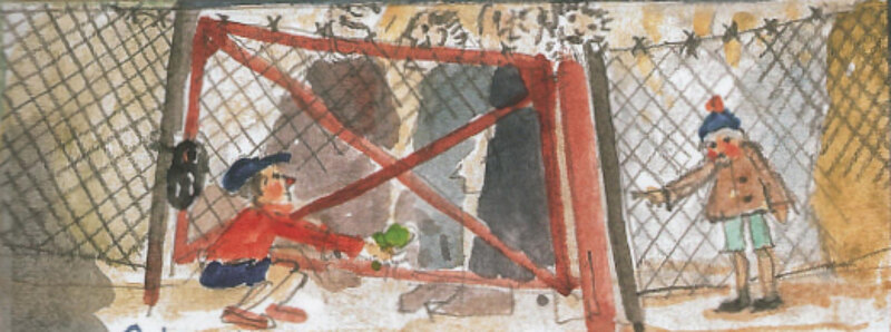 „Mit dem Vater spazierte ich durch unser Wohnviertel, an einem Zaun entlang, hinter dem ein flaches Gebäude stand. Ein Kindergarten oder eine Turnhalle? Hinter ein mit Drahtgeflecht bespannten Tor standen ein paar Männer. Die schauten zu einem Schuljungen, der etwas unter dem Tor durch schob. Ein Bund Petersilie.