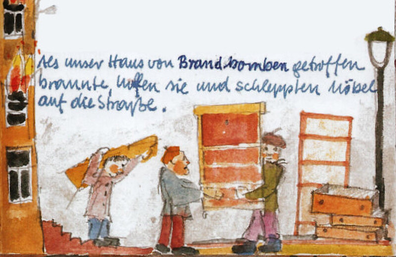 „Bei dem großen Bombenangriff im Oktober 1943 wurde auch unser Haus getroffen. Brandbomben hatten es in Brand gesetzt. Wir verließen den Luftschutzkeller, warteten auf einer Wiese vor dem Haus. Warteten auf den Morgen, hofften dass Hilfe zum Löschen der Flammen kommt, hofften dass das Feuer von selbst ausging, keine Nahrung mehr findet, hofften, dass nicht Teile des Hauses einstürzen, so könnte unsere Mutter noch ein paar Möbel retten. Wir wohnten im Erdgeschoss und bis das viergeschossige Haus vom Dach bis zum Erdgeschoss ausgebrannt war, das dauerte seine Zeit; Also zuerst die Betten und den Inhalt der Kleiderschränke. Aus der Speisekammer und der Küche gabs nichts zu holen außer Geschirr und leeren Töpfen. Und dann geschah das Schreckliche und Wunder zugleich.