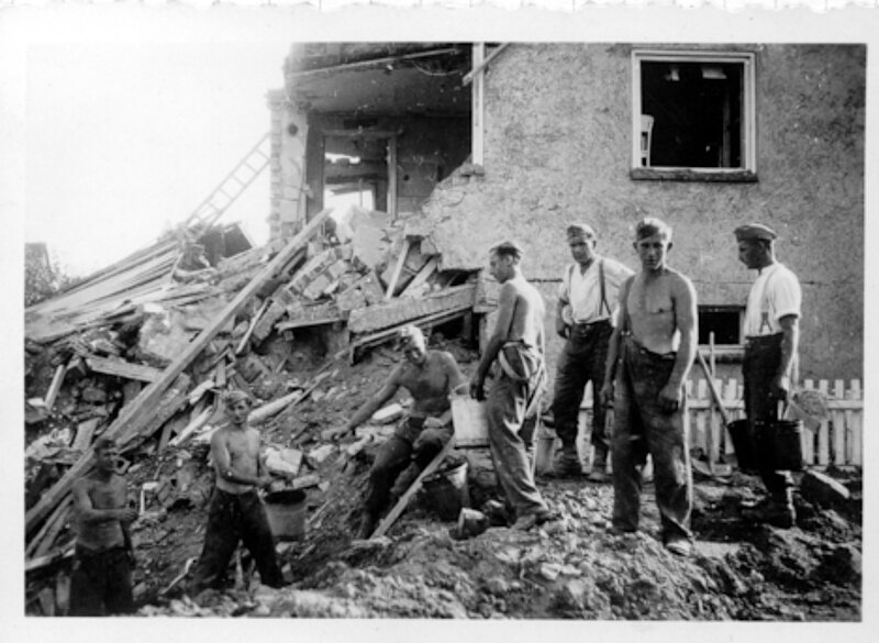 Getroffen wurden bei diesem Angriff auch die Fieseler– Erlenfeld- und Eichwaldsiedlung, wo 43 Menschen ums Leben kamen. Das Bild zeigt ein zerstörtes Haus in der heutigen Singerstr. das von Zwangsarbeitern notdürftig repariert wurde. Am 30. Juli 1943 wiederholten die Flugzeuge diesen Angriff, wobei 157 Menschen starben.
