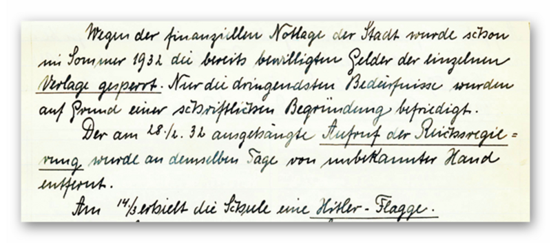 1932 erhielt die Schule ihre Selbständigkeit. Am 08.03.1933 ist zu lesen: „Schulausfall wegen des günstigen Ausfalls der Reichs– und Landtagswahlen“. Das Dritte Reich warf seine Schatten voraus. Die Reichstagseröffnungsfeier wurde in der Bürgerschule 26 im Radio angehört, da die Hilfsschule selbst keinen Rundfunkempfänger hatte. Am 14.03.1933 erhielt die Schule eine „Hitler-Flagge“, schreibt der Chronist. Dagegen war der ausgehängte "Aufruf der Reichsregierung" (gebt mir 4 Jahre Zeit) von unbekannter Hand entfernt worden.