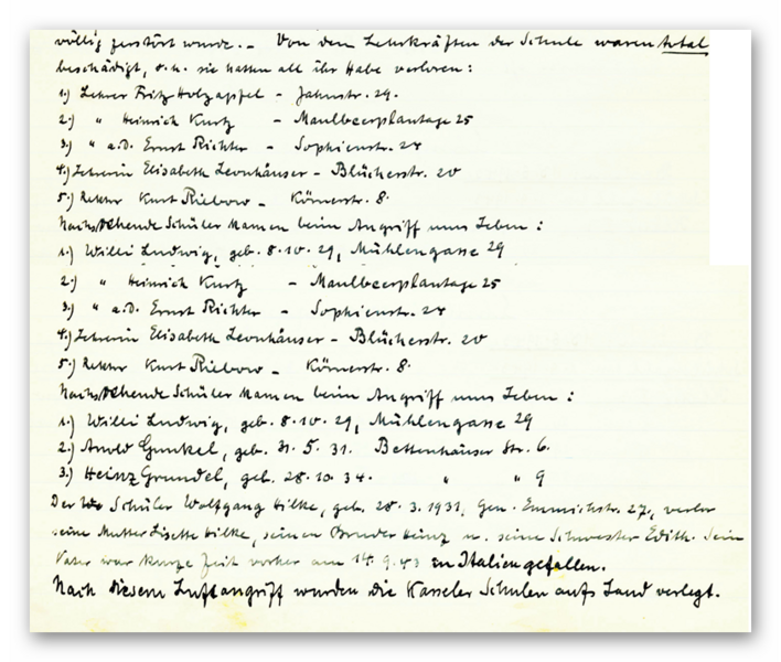 Nach diesem Angriff wurden die Kasseler Schulen aufs Land verlegt. Die Lehrer kamen an Schulen im Landkreis. Am 3. April wurden die Kinder in das geschlossene „KLB-Lager“ überführt. Hier wird die Problematik in diesem Lager ausführlich geschildert.
