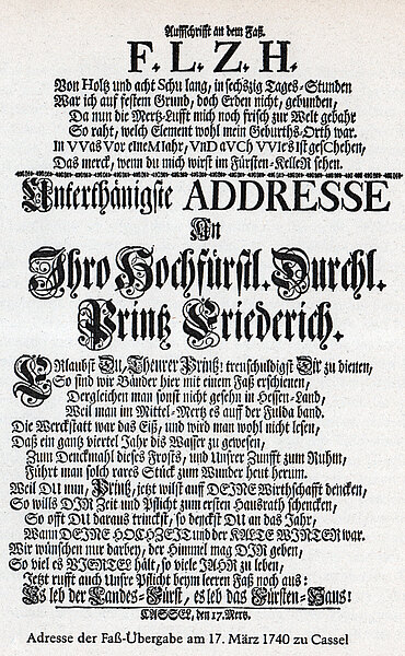 Nach dem in Frankfurt 100 Jahre später dieses Spektakel zur Nachahmung führte, beschloss die Kasseler Küferzunft am 18. März 1845 bei ähnlichem winterlichen Frost wie 1740 den Bau eines Weinfasses auf der Fulda zu wiederholen. Sie richteten auf dem Eis der Fulda im März 1845 zwischen der Unterneustadt und dem Renthof einen Werkplatz ein. Sie zimmerten bei Tag und selbst bei Fackellicht oder hellem Mondschein bis in die späte Nacht. Die Küfer hatten Glück, kurz bevor das Tauwetter einsetzte war das Wunderfass fertig. Am 28. März 1845 war es dann soweit das Fass wurde von der Fuldabrücke aus in einem feierlichen Umzug durch die Altstadt am Rathaus vorbei zum Palais der Kurfürsten am Friedrichsplatz geführt um es dem Prinz-Mitregenten und späteren Kurfürsten Friedrich Wilhelm zu überbringen. Den Zug führte der Gildemeister Schäfer an, Karl Herbold und der damalige Oberbürgermeister Ludwig Arnold begleiteten ihn. Herbold, der sog. "Bürgerkönig", war bei Hofe wegen seiner politischen Tätigkeit nicht gut angeschrieben und der Regierungsrath Arnold missfiel in der Ausübung seines Amtes der konsrvativen Regierung sehr.