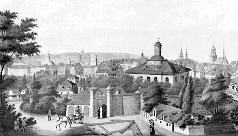 Das Bild von Ernst Metz zeigt die bauliche Situation des „ Leipziger Platz", (später Unterneustädter Kirchplatz) um 1831, aus der Perspektive vor dem Leipziger Torausgang.