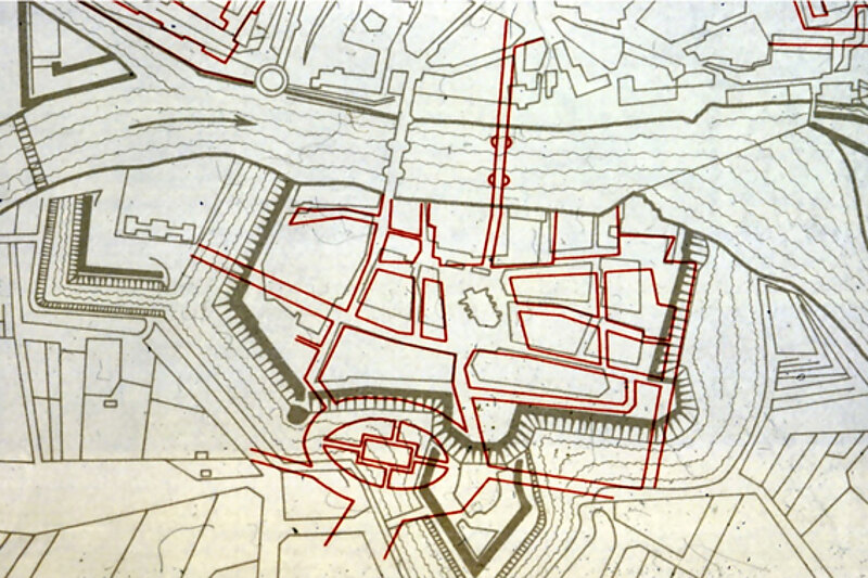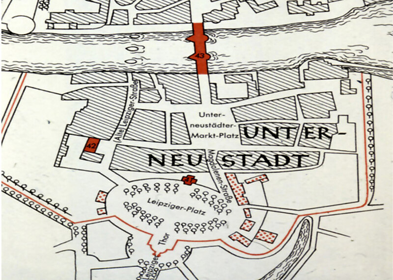 Die in rot eingezeichnete, vorhandenen Festungswerke sind durch Lessing 1880 eingetragen, die dunkle, schmale Linie ist die Zollmauer um die Unterneustadt. Ellipse links Zeugmantel, Ellipse rechts No. 32, Leipziger Tor und Unterneustädter Kirchplatz, in der Mitte No. 7 Kirche, No. 19 Kastell, No. 36 Wilhelmsbrücke, No. 5 Brüderkirche, No.18 Renthof, No. 5 Brüderkirche, No. 34 Altmarkt, No. 17 Marstall, No. 6 ehemalige Lutherkirche, No. 15 Chattenburg und No. 18 Packhof.