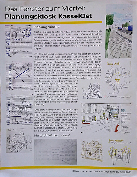 - Projektbeschreibung und Teilergebnisse des Projektes „Planungskiosk Kassel Ost“ des Fachbereiche 06 der Universität Kassel, Präsentation in der Buttlarstraße 6, in der Zeit vom 12. Bis 14. Juli 2022.