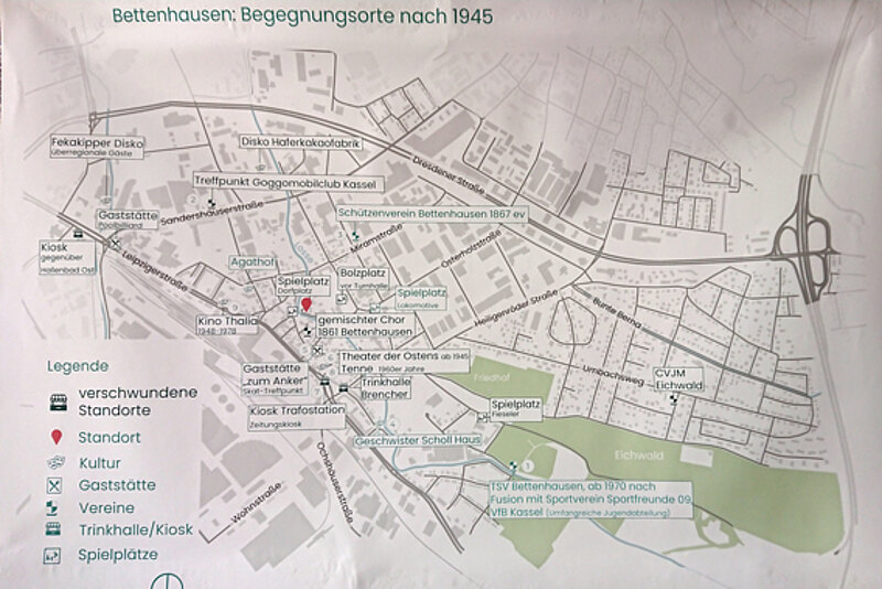 Unter dem Stichwort „Begegnungsorte nach 1945“ fanden die Interviewer auf Anhieb zwanzig relevante Standorte zum Thema. In einem Übersichtsplan mit Legende wurden die Institutionen lagegenau kartiert und im Anhang beschrieben.