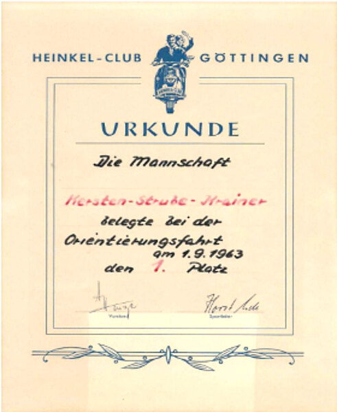 Anfang der 60er Jahre hatten sich in Kassel mehrere Fahrer von Heinkel – Tourist - Motorrollern zum „Heinkel – Club Kassel“ zusammen geschlossen. Zu den ersten Mitgliedern gehörten, Günter Schnell, Friedhelm Kersten, Hans – Peter Wagner, Wilfried Wagner, Theo Heuer, und Peter Noll. Später kamen Wilfried Strube, Günter Wagner, Vater und Sohn Boynsen, und Hans und Herbert, deren Nachnamen mir heute nicht mehr geläufig sind, hinzu. Wir Mitglieder haben viele gemeinsame Camping – Wochenenden auf dem alten Campingplatz in Bad Zwesten, am Edersee, in Göttingen, in Hildesheim und Wuppertal verbracht. Bei den Treffen wurden immer Geschicklichkeitsprüfung und Orientierungsfahrten veranstaltet. Die Fahrer des damaligen Heinkel – Clubs nahmen auch öfters an Orientierungsfahrten des Kurhessischen Motorklubs teil.