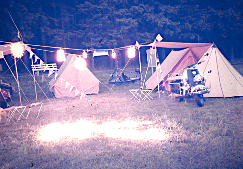 Wochenend-Zeltlager 1964 auf dem Campingplatz in Bad Zwesten, rechts der Motorroller von Mitglied Wilfried Strube mit Zelt, in der Mitte das Zelt und der Motorroller von Hans-Peter Wagner, links das Heck des Motorrollers von Theo Heuer.