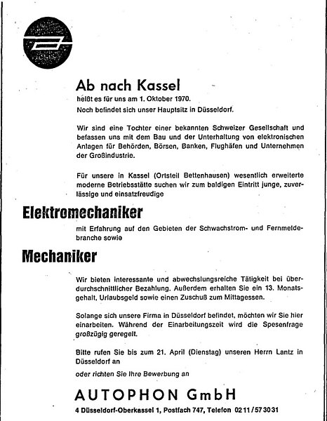 Im Frühjahr 1970 las ich in der Zeitung eine Stellenanzeige der Firma Autophon, die Mechaniker suchte. Nach meiner schriftlichen Bewerbung fand ein Vorstellungsgespräch mit dem Geschäftsführer im Hotel Hessenland statt. Nach erfolgreicher Bewerbung trat ich am 1.Juli meine neue Arbeitsstelle in Düsseldorf-Oberkassel, dem damaligen Hauptsitz der Firma, an. Die Firma befand sich in einem ehemaligen Metzgerladen. Im Verkaufsraum waren die Büros untergebracht, der Kühlraum diente als Lager und wo früher Fleisch verarbeitet und Wurst hergestellt wurde befand sich die Werkstatt. Bei meiner Tätigkeit lernte ich die von der Firma Autophon hergestellten Anlagen am Düsseldorf Airport und an der Börse in Düsseldorf kennen.