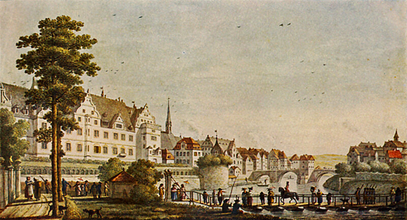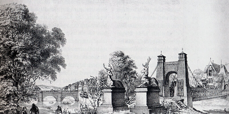 Im Zusammenhang mit diesem Aufruf muss an die Errichtung der Schiffbrücke erinnert werden, welche in französisch-westphälischer Zeit an der betreffenden Stelle in den Sommermonaten errichtet worden war, aber davor schon im 18. Jahrhundert zu verschiedenen Zeiten Bestand hatte. Aus den beigefügten Abbildungen lässt sich deutlich erkennen, dass die Schiffbrücken genau an derselben Stelle aufgeschlagen waren, an welcher sich gegenwärtig die feststehende Drahtbrücke befindet und wozu anderen Zeiten ein Fährbetrieb mit einem Kahn für Fußgänger eingerichtet worden war.