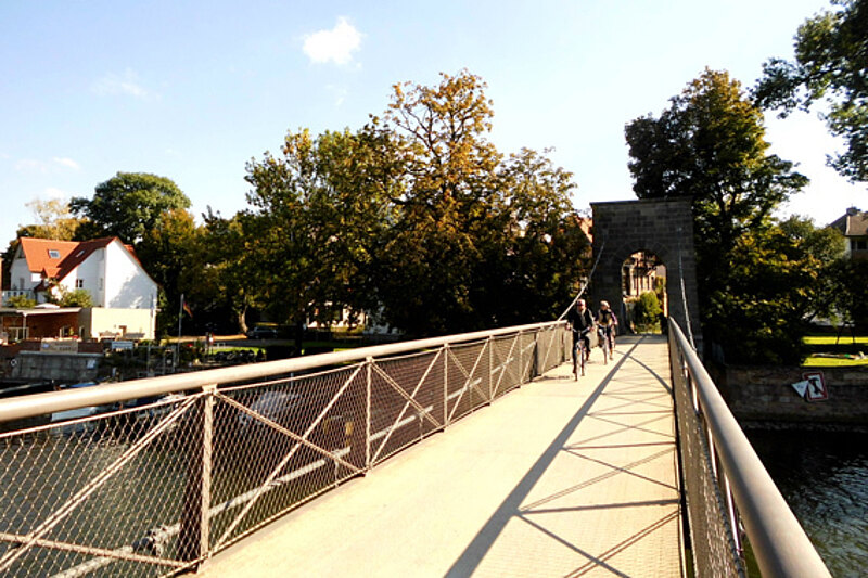 Eine Hängebrücke, deren Drahtsystem an zwei Pylonen aufgehängt ist, geht über die Fulda vom Kasseler Auedamm mit einer Spannweite von 84 m zur Sternstraße in der Unterneustadt.