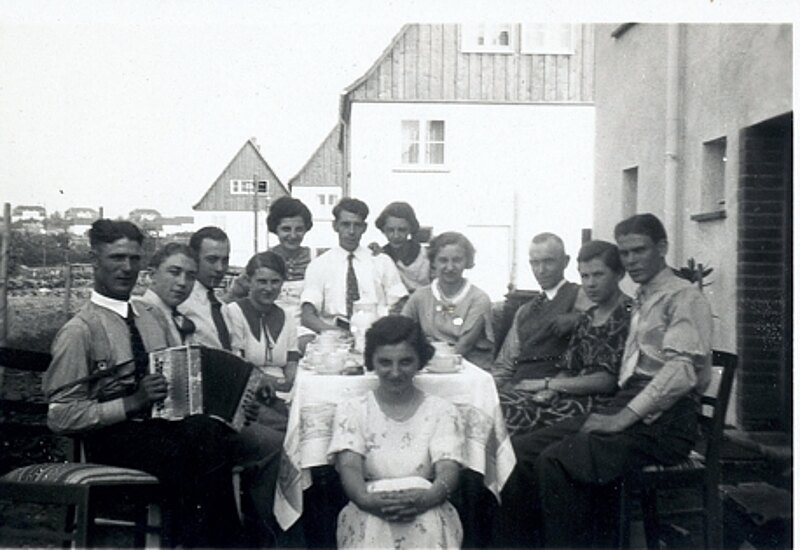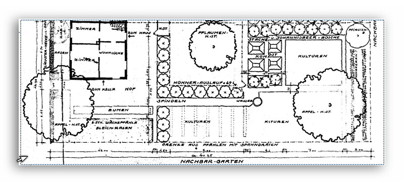 Und als das Ernten im Garten losging, gab es manche blanke Augen. Jeder wollte in Haus und Garten sein möglichstes tun. Dann kam der Wettbewerb des Herrn Fieseler, bei dem der eine oder der andere als Anerkennung seiner Arbeit einen Preis erzielte. Um den Garten aber leistungsfähig zu erhalten, mußte Mist verabreicht werden. Um diesen zu erzielen und die vielen Gartenabfälle nutzbringend zu verwerten, begannen viele Siedler mit der Kleintierzucht. Hühner, Kaninchen, Ziegen und Schweine ergänzten das Siedlungsbild und mancher Siedler wurde fanatischer Kleinbauer. So wäre ja alles in schönster Ordnung gewesen, wenn nicht der Krieg im Jahre 1939 mit all seinen Begleiterscheinungen auf den Plan getreten wäre. An einem Sonntag gab es plötzlich Lebensmittelmarken und - Karten und ab sofort war alles rationiert, auch Spinnstoffe und Lederwaren.