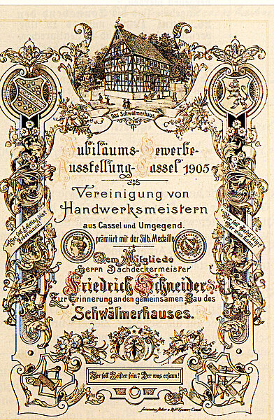 Zur Jubiläums-Gewerbe-Ausstellung 1905 in der Orangerie und auf dem Gelände der Hessenkampfbahn baute die Vereinigung, unter Mithilfe der Firma Schneider, ein Schwälmer Bauernhaus nach. Nach Ende der Ausstellung wurde das „Schwälmer Haus“ von dem Fabrikanten Berneburg gekauft und oberhalb von Nordshausen am Baunsberg wieder aufgebaut, wo es bis heute privat genutzt wird.