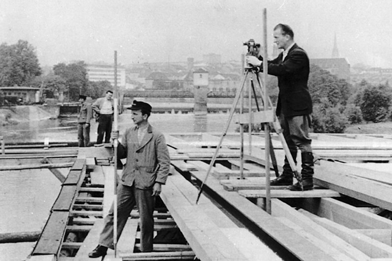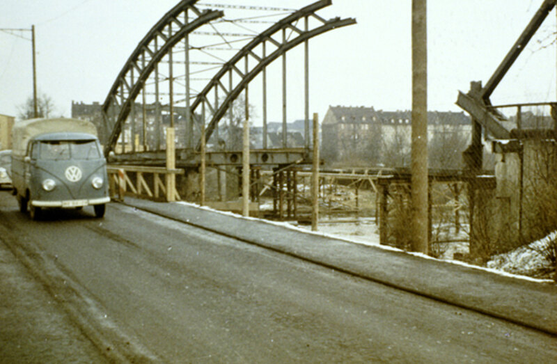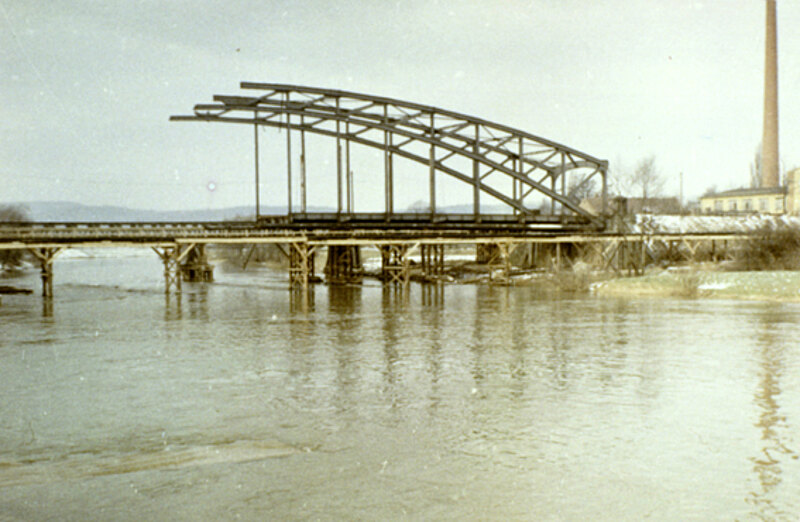 Erst 1957 wurde sie mit einer Spannbetonbrücke ersetzt und 1959 von der Firma Beton- und Monierbau fertiggestellt. Für die Bauzeit bestand eine Notbrücke paralell daneben. Sie ließ nur einen einspurigen Verkehr zu. Nachdem sich schon 1962 erste Risse an dem Neubau bemerkbar machten, wurde die Brücke 1984 saniert.