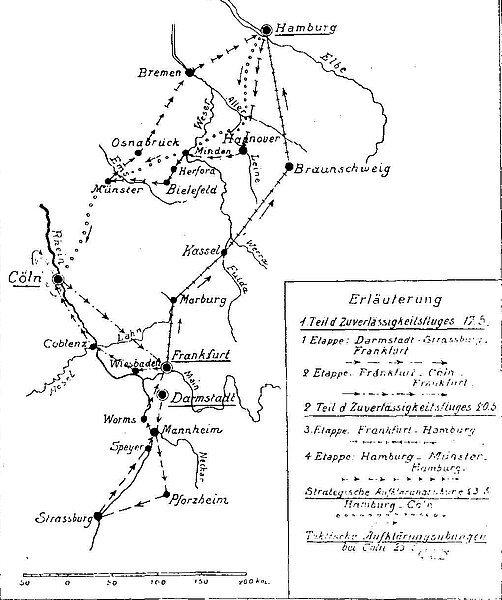 Bei diesem Flug im Mai 1914 lag auch Cassel als Kontrollstation auf der Wettbewerbsstrecke: Darmstadt – Mannheim – Pforzheim – Straßburg – Speyer – Worms – Wiesbaden – Coblenz – Frankfurt/Main – Marburg – Cassel – Braunschweig – Hamburg – Hannover – Minden – Herford – Münster – Osnabrück – Bremen – Köln.