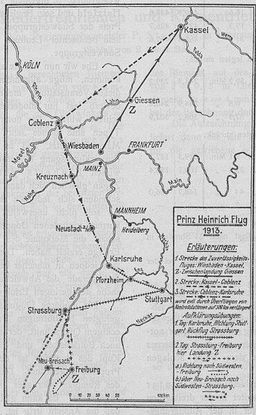 In der Zeit vom 10. bis 17. Mai 1913 fand der 3. deutsche Zuverlässigkeitsflug am Oberrhein statt, der mit Genehmigung Seiner Königlichen Hoheit des Prinzen Heinrich von Preußen den Namen „Prinz Heinrich-Flug 1913" führt. Prinz Heinrich von Preußen leitete selbst den Flug. Der Prinz Heinrich-Flug (Oberrheinflug 1913) startete in Wiesbaden. Von dort ging es über Gießen- -Cassel - Coblonz nach Karlsruhe.