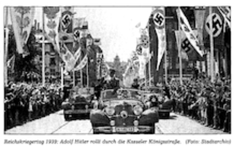 Die „Kasseler Neueste Nachrichten“ berichtet von einer Triumphfahrt. Hitler steht und grüßt in seinem offenen Wagen. Er rollt über die Leipziger Straße, die Fuldabrücke, die Altstadt hinaus bis zur Königsstraße. Tausende Kasseler jubeln ihm frenetisch zu. Das Stadtzentrum ist ein einziges Fahnenmeer. Überall sind Lautsprecher aufgestellt. Menschen, insgesamt wohnen rund 200 000 Bürger dem Kriegertag bei, säumen jubelnd die Straßen. Es ist ihnen jedoch untersagt, Blumensträuße mitzubringen oder sie gar in das Auto Hitlers zu werfen. Es besteht Gefahr für die Volksgenossen, lautet die Begründung. Hitler fährt auf den Friedrichsplatz, auf dem große Tribünen errichtet sind, und erreicht schließlich die Karlswiese in der Aue. Das riesige soldatische Spektakel, eine gewaltige Parade und einzige Machtdemonstration des Hitler-Regimes, beginnt.