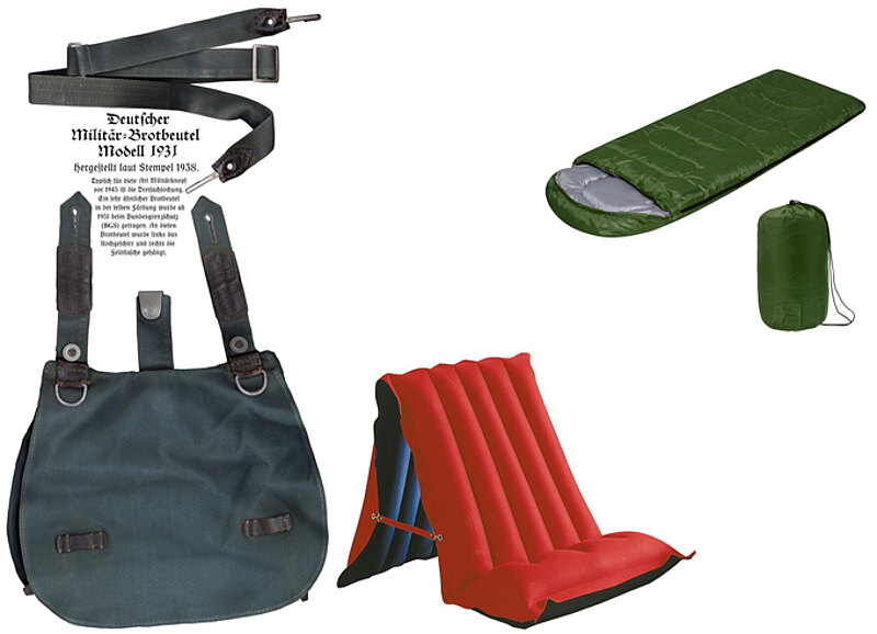 Aus heutiger Sicht war auch die weitere Ausrüstung vorsintflutlich und von den Restbeständen der Wehrmacht des 2. Weltkriegs geprägt. Für den täglichen Proviant und sonstige wichtige Reisedokumente erstand ich einen Brotbeutel aus Segeltuch, den man mit Schlaufen am Lenkrad befestigen konnte. Als Regenschutz lieferte der CVJM eine knöpfbare, imprägnierte Baumwollplane, die zum Übernachten mit einem zweiten Teil verbunden werden konnte und so zum Firstzelt (der sogenannten „Dackelgarage“) wurde. Meine neue rot/blaue Gummiluftmatratze aus dem Werksverkauf der Firma WEGU hatte die stolze Breite von 78 cm und eine Länge von 1,90 m. Der olivgrüne Schlafsack aus Baumwolle trug damals noch keine Angaben für welche Temperaturen er gefertigt worden war, hat aber immer ausreichend gewärmt. Der Glanzpunkt meiner Ausrüstung war ein Tornister aus dem 2. Weltkrieg, der wegen seiner Fellabdeckung aus Pferdefell auch „Affe“ genannt wurde. Dazu kam eine filzummantelte Aluflasche mit Trinkbecher für kalte und warme Getränke. Ich habe diese zusammengesuchte Ausrüstung nicht gewogen, rückblickend kann man aber von etwa 25 – 30 kg Gesamtgewicht ausgehen.