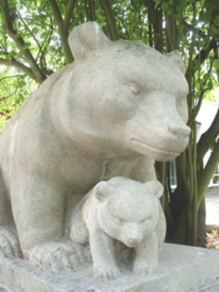 Generationen Forstfelder Kinder kennen diese Skulptur vor dem Haupteingang der Schule Am Lindenberg. Bildhauer Heinz Wiegel formte diese Plastik bei der Lauckhardtschen Zementwarenfabrik in Weimar bei Kassel. Wiegel will mit dieser Plastik, bei der eine Bärenmutter ihr Junges zwischen den Tatzen schützt, "Kunst und Vokstümlichkeit vereinen...auf der Plastik sollen die Kinder der Togo-Schule herumklettern und herumrutschen können". Die Plastik wiegt 60 Zentner und ist 1,85 m lang und 1,60 m hoch (Quelle: HA Juli 1955).