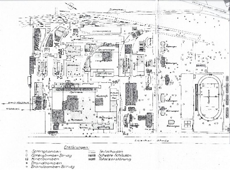 Die Sulfidierung wurde durch eine Luftmine getroffen. Einige Behälter des Schwefelsäurelagers und der Laugestation wurden zerschlagen. Die Wassermassen des beschädigten Klärbeckens strömten in die Luftschutzkeller unter den Werkstätten (Bau 21), hinzu kamen Säure und Lauge. Es gab schwere Verletzungen infolge Verätzungen. An diesem Tage fielen etwa 220 Sprengbomben von ca. 250 und 500 kg sowie 32 Phosphorbrandkanister und 2 Minen von je 1800 kg auf unser Werk. Das Werk lag 4 Monate lang still (bis zum 10. August 1944) und konnte dann nur mit 40 % der vorherigen Kapazität weiterfahren. Bei einem der vielen Angriffe sind auch die Werksküche und der Speisesaal im Bau 26 (heute „Haus der Technik") zerstört worden. Durch schnelles Heranschaffen neuer Kochkessel konnten jedoch nach 36 Stunden bereits wieder 1300 Essen ausgegeben werden.