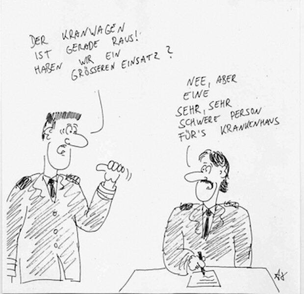 Der Rettungswagen wurde zu einem medizinischen Notfall in ein zweigeschossiges Wohnhaus in der Forstfelder Windhukstraße gerufen. Bei Ankunft mussten die Helfer feststellen, dass es sich um eine schwergewichtige weibliche Person handelt, die eine Noteinweisung für das Krankenhaus hatte. Da es die beiden Rettungssanitäter allein nicht schafften, wurde ein zweiter Rettungswagen zur Unterstützung herbeigerufen. Als man jedoch die Patientin nicht durch das Treppenhaus bekam, wurde die Feuerwehr auf den Plan gerufen. Man forderte den Kranwagen an. Mit Hilfe von Hebebändern wurde die Person durch ein Fenster der Wohnung mit dem Kran der Feuerwehr herausgehoben und mit vereinten Kräften in den Rettungswagen geladen. Nach etwa zwei Stunden erreichte ein Anruf der Klinik die Feuerwehrleitstelle, es wurde gemeldet, dass die Patientin verschwunden sei. Daraufhin wurde die Polizei verständigt, die dann feststellen musste, dass sich die Patientin wieder in ihrer Wohnung befand. Jetzt standen alle beteiligten Hilfskräfte vor dem großen Rätsel: Wie hat es diese Frau ohne Hilfe des Kranwagens geschafft, wieder in ihre Wohnung zu gelangen?