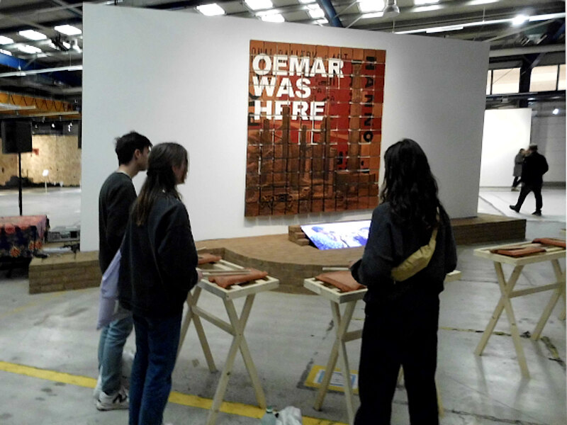 Amol K Patil aus Indien schaffte eine Installation, die unter anderem aus einer Bühne mit kinetischem Sand, die aus einem Hologramm, einem Screening und mehreren Objekten besteht. In Sweep Walkers (2022) bewegen sich dann auch Performer*innen auf Rollschuhen mit Reinigungsbürsten durch die Ausstellungsräume, aus Radiogeräten kommt Musik. Auf dem Hübner-Areal sah man immersive Skulpturen, die den Reiserouten Patils Großvaters und vieler anderer nachgebildet sind.