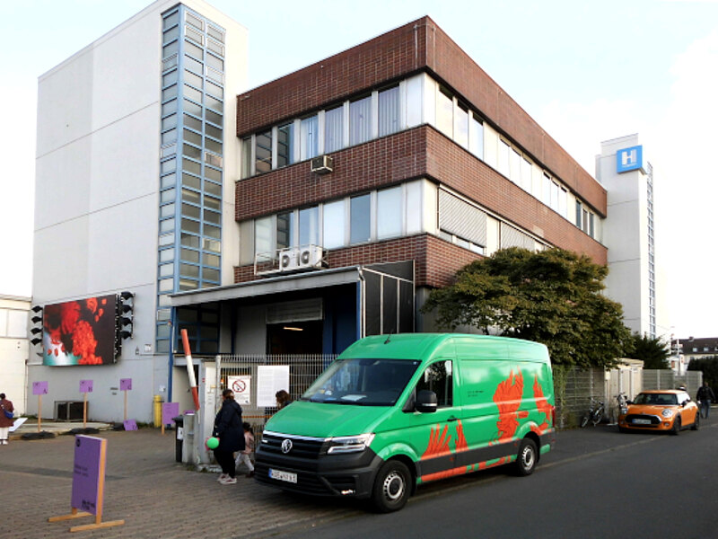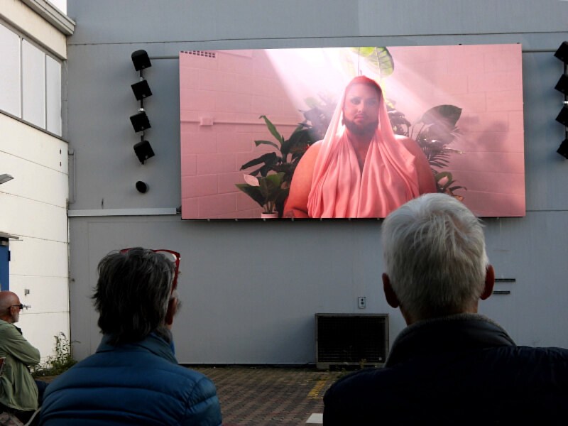 Videoinstallation zur d15 auf der Außenwand der Firma Hübner