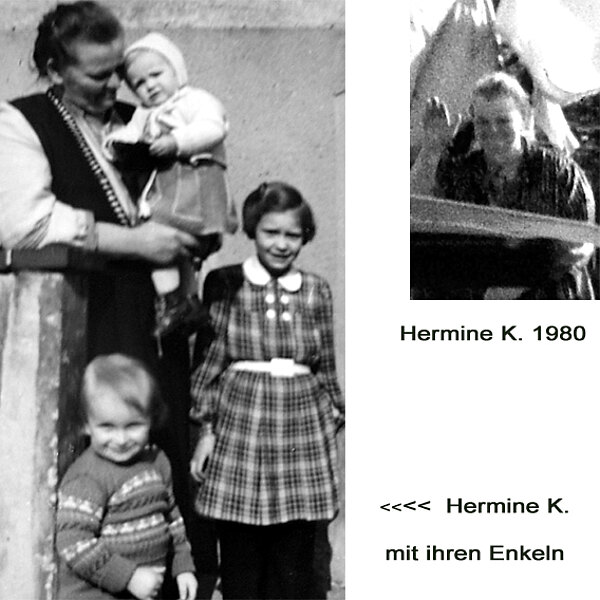 Zum letzten Mal besuchte die Autorin mit ihren drei Töchtern die inzwischen verwitwete Hermine K., um ihren Töchtern Erinnerungen an die Zwillingsschwester ihrer Urgoßmutter Auguste St., die schon am 1. 10. 1972 verstorben war, zu ermöglichen. Großtante Hermine erzählte, dass sie nicht mehr so gut schlafen könne und am frühen Morgen bereits in der Küche sei, um das Mittagessen vorzubereiten. Die Lebensmittel erhielt sie aus dem Lebensmittelgeschäft von Sohn Hans und Ehefrau Ilse nebenan in der Stegerwaldstraße. Schon der Zeitungsausträger bekam von ihr frühmorgens eine Kostprobe vom Reibekuchen oder "Arme Ritter". Sie ist uns als liebe Verwandte in Erinnerung geblieben, die Verständnis für unseren ständigen Hunger hatte. Beim letzten Besuch am Krankenbett war ihre Tochter Martha bei ihr und sie sang ein Kirchenlied. Unsere liebe Tante Hermine, geb. 28. 8. 1895, erreichte ihr Ziel, das war ihr 90. Geburtstag. Für Nachbarn in Bettenhausen/Forstfeld und für uns bleibt sie als "gute Frau" in Erinnerung. Sie verstarb wenige Tage später im September 1985 friedvoll im Kreise ihrer Familie.