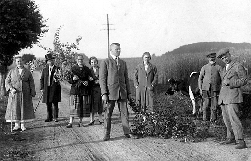 Am Morgen nach der ausgiebig gefeierten Hochzeit der Schwester Emma W. mit Hermann B. entstand der ungewöhnliche Schnappschuss mit dem Kühe hütenden Brautvater Hermann W. In der Feldlage von Herbrechtsdorf zeigt das Foto von links, Hermine W., einen als „Lippscher Fürst“ verkleideten Bruder, Auguste und Anna W., das Brautpaar, Vater Hermann W. und eine unbekannte Person.