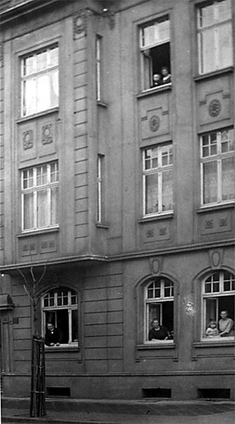 Simon K. arbeitete wie der Rangierer Heinrich St. in Duisburg auch bei der Reichsbahn. Heinrich St. bewohnte mit seiner Frau Auguste und zwei Kindern, Heinz und Anneliese (die 91 jährige Mutter der Autorin), eine Wohnung im obersten Stockwerk eines mehrgeschossigen Bürgerhauses in der Gabelsbergerstrasse in Duisburg. In die Parterrewohnung zogen Familie Simon und Hermine K. mit ihrer Tochter Martha, die spätere Postangestellte und Buchhalterin ihres Vaters, ein. Oben im 2. Stockwerk ist Auguste St. mit Sohn Heinz zu sehen, unten Simon und Hermine K. mit Tochter Martha.