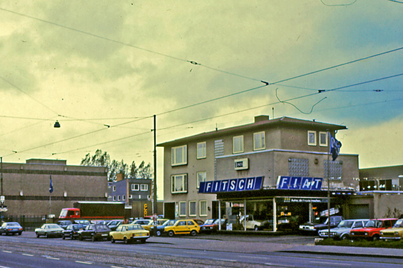 1957 zehn Jahre nach der Gründung bereits war eine Erweiterung des Betriebsgeländes erforderlich. Das Autohaus zog von der Leipziger Straße 175 auf das Grundstück 129. Die Bomben des zweite Weltkrieges hatten dort den gesamten Salzmanns Hof zerstört. Die Gebäudereste wurden nach dem zweiten Weltkrieg abgerissen und auf dem Gelände entstanden gewerbliche Zweckbauten. So auch das moderne Autohaus Fiat-Fitsch mit Werkstatt, Verkaufs- und Ausstellungshalle sowie Bürogebäude.