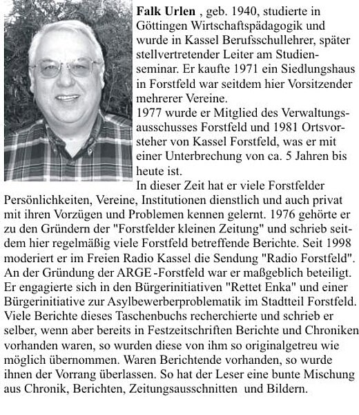Der Forstfelder Ortsvorsteher Falk Urlen stellt zum Stadtteilfest zur Eröffnung des Forstfelder Stadtplatzes (heute Häschenplatz) im Jahr 2002 eine Bestandsaufnahme aus Vereinszeitschriften, Interviews, persönlichen Beiträgen und Zeitungsberichten zusammen. Sein Buch hat er in der Anlage als PDF-Datei ohne Bilder (wegen der Dateigröße) beigefügt.