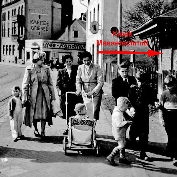 Ein Holzbüdchen mit besonderer Anziehungskraft stand in der Leipziger Straße 175, direkt an der Straßenbahnhaltestelle „Kirchgasse“ auf dem Grundstück der Kirchengemeinde. Hier verkaufte Hermine Messerschmitt ab 1946 aus einer knapp zehn Quadratmetern großen Holzhütte mit Pappdach frisches Obst und Gemüse direkt aus der Kiste vom Erzeuger. Der dahinterliegende Friedhof war schon seit langer Zeit eingeebnet und das Schiff der Marienkirche lag noch in Trümmern. Das danebenstehende Haus Leipziger Straße 179 der Familie Fitsch war durch Bomben völlig zerstört worden. In der abzweigenden Kirchgasse betrieb der Fiat Händler Hartmut Fitsch in drei maroden, eingeschossigen Gebäuden seine erste bescheidene Autowerkstatt.
