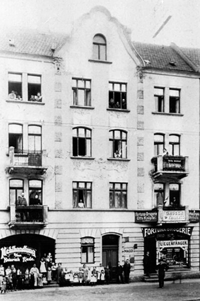 Im Ladengeschäft rechts eröffnete im Jahr 1906 der Apotheker Otto Knöpfel die Fortuna-Drogerie. Der Apotheker scheint mit seinem Geschäft offensichtlich nicht viel Glück gehabt zu haben, denn schon ab 1912 ist in den Räumen ein Hausschlachter namens Gerling verzeichnet.