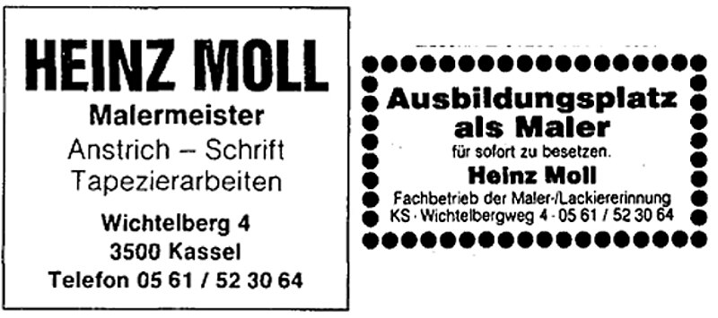 Die wirtschaftlichen Zeiten änderten sich und mit ihnen die Werbetechnik. Nach der Umstellung der gemalten Schrift in Neon-Anlagen und der Textgestaltung auf dem Computer machte er seine Meisterprüfung als Maler- und Lakierermeister, um als Schildermaler nicht arbeitslos zu werden. 38 Jahre war Heinz Moll als Unternehmer selbständig. Er bildete acht Lehrlinge aus, die den Haupt- oder Sonderschulabschluß hatten. Sieben von acht dieser Lehrlinge bestanden unter seiner Leitung die Gesellenprüfung. Fünfundzwanzig Jahre arbeitete er mit einem Gesellen zusammen. Mit 64 Jahren meldete Heinz Moll seinen Betrieb ab.