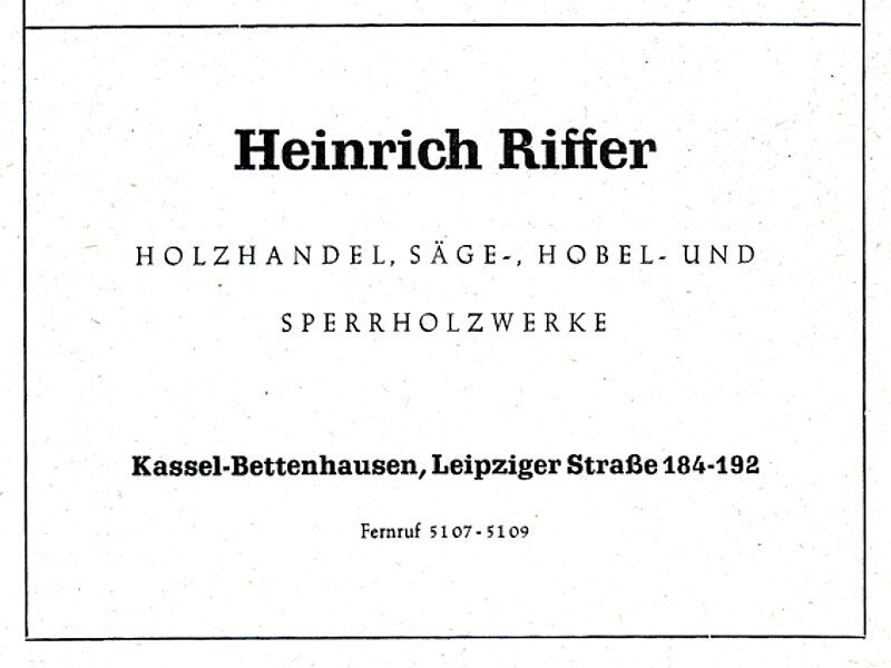 An der Leipziger Straße 184 – 192 baute Riffer ein Verwaltungsgebäude mit angeschlossen Holzgroßhandel. In einer großen Lager- und Trockenhalle lagerten viele Festmeter Schnittholz und waren so zur Qualitätssicherungen vor Witterungseinflüssen geschützt. Die Bomben des 2. Weltkrieges zerstörten beträchtliche Teile der Firmengebäude in Kassel.