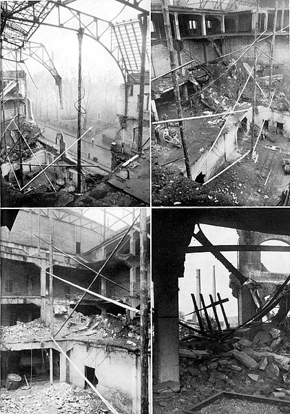 Das sollte sich nach kurzer Zeit jedoch ändern! Es dauerte nicht lange und über uns brach ein Inferno herein. Es krachte rings um uns herum. Die Wände fingen an zu zittern und der Boden fing an zu beben. Die Angst stand uns ins Gesicht geschrieben. Wir waren froh, nach Ende des Angriffs, heil davon gekommen zu sein. Was wir draußen vorfanden war allerdings fürchterlich! Sprengbomben hatten Teile des Verwaltungsgebäudes zerstört. Die Weberei und benachbarte Bereiche brannten. In Unkenntnis der Geschehnisse außerhalb des Werkes, wurde ich als Melder beauftragt, zum nahe gelegenen Polizeirevier 6 zu laufen, um von dort die Feuerwehr zu alarmieren, denn das Telefonnetz war zusammen gebrochen. Das Polizeirevier befand sich in der Nähe des heutigen Platz der Deutschen Einheit.