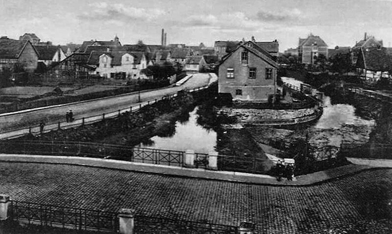 Die Ansichtskarte oben links zeigt den Blick von der Brücke Osterholzstrasse über die Losse zum Dorfplatz. In der Mitte ist der Inselweg und die Losse-Insel zu erkennen. der Mühlgraben ist am linken Bildrand nur schwer auszumachen. (Foto:Eberth)