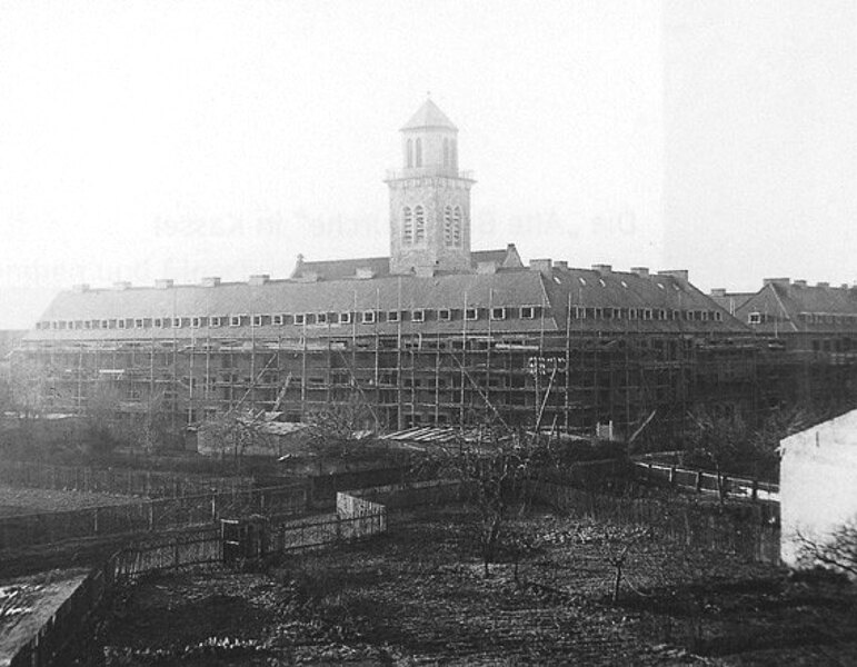 In einem ersten Bauabschnitt entstanden 1928 an der Leipziger Straße am Kunigundishof und in der Großalmeroder Straße 136 Wohnungen. Im Bild zu sehen sind die Dachdeckerarbeiten, die von der Bettenhäuser Firma Schneider ausgeführt wurden. Im Jahr 1930 konnte dann der zweite und letzte Bauabschnitt mit 59 Wohnungen in der Melsunger Straße bezogen werden. Damit war das ungewöhnliche Bild einer dreigeschossigen Bebauung, die die Kirche und den Hof von St. Kunigundis gleichsam einfasst, geschaffen. Mit der Kirche auf Tuchfühlung wohnen die Mieter im Kunigundishof. Die katholische Kirche St. Kunigundis ist Namensgeberin für die stimmungsvolle Wohnsiedlung aus den 30er Jahren.