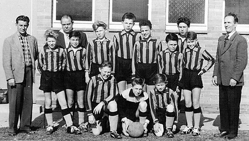 Es fehlte an allem. Wir hatten keine eigenen Fußballschuhe. Trikots in Schwarz und Blau gestreift waren pro Mannschaft nur jeweils 10 Stück, sowie 10 blaue Hosen und Stutzen vorhanden; plus eine komplette Kluft für den Torwart. Wir waren alle mit großem Eifer dabei und die Elf Jungen, die vom Jugendwart Karl Lotze in der Aufstellung waren, trugen das Trikot mit Stolz. Elf Paar Fußballschuhe waren für die Schülermannschaft vorhanden. Viele Fußballschuhe waren den Spielern zu groß. Es machte nichts, notfalls wurden ein Paar Ersatzstrümpfe vorn in die Schuhe gesteckt. Passt, sagte der Jugendleiter und auf ging es auf den Platz. Da es sich die ersten Jahre um Freundschaftsspiele handelte, konnten die Spieler öfters ausgewechselt werden.
