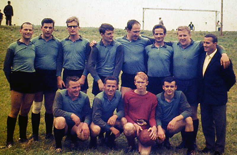 Hinten von links: Erwin Heidt, Norbert Bierey, Klaus Thiel, Heinz Heising, 5.ter von rechts: Torwart Horst Weiffenbach, Schäfer, Wilfried Strube. Vorn von links Winfried Jagdmann, vorn von rechts Achim N.N., Ullrich Knabe, Horst Schönewolf.: