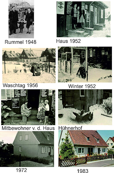 „Aufgebaut wurden sie teilweise erst nach dem Krieg. Das Haus hatte insgesamt 5 Zimmer, Küche auf ca.85 m². Sie sind voll unterkellert. Im Wohnzimmer wurde in einer Zinkwanne gebadet und im Garten hielten wir auch Hühner. Unsere Nachbarn zupften säckeweise Schafwolle wobei wir dann auch geholfen haben, Auch ein Schwein hatten sie zeitweise.